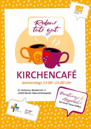 Immer donnerstags von 13:00 bis 15:00 Uhr findet unser Kirchencafé mit offener Wegweiserberatung in St. Antonius (Roedernstr. 2, 12459 Berlin-Oberschöneweide) statt. Eine Anmeldung ist nicht erforderlich, kommen Sie einfach vorbei!