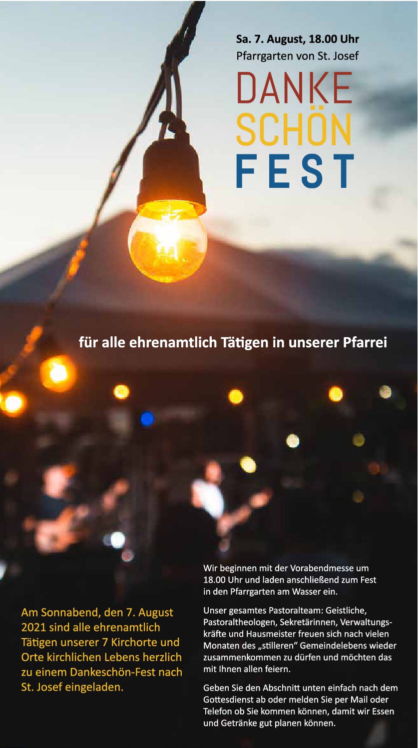 Herzlich laden wir vier Geistliche der Pfarrei, alle unsere pastoralen Mitarbeiterinnen und Mitarbeiter, unsere Sekretärinnen, Verwaltungsmitarbeitende und Hausmeister… Sie, die ehrenamtlich in unseren drei Kirchengemeinden Christus König, St. Antonius und St. Josef Tätigen nach 1 1/2 Jahren Corona-Pandemie zu einem „Dankeschön-Fest“ auf die Pfarrgartenwiese an der Spree nach St. Josef ein. Wir beginnen um 18.00 Uhr mit der Hl.Messe.