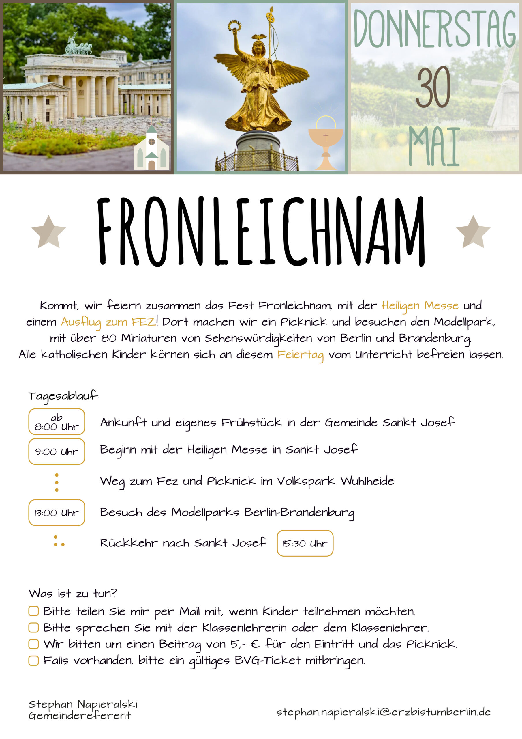 Wir feiern zusammen das Fest Fronleichnam, mit der Heiligen Messe und einem Ausflug zum FEZ. Dort machen wir ein Picknick und besuchen den Modellpark Berlin-Brandenburg, mit über 80 Miniaturen von Sehenswürdigkeiten von Berlin und Brandenburg. Am Ende des Tages kehren wir nach Sankt Josef zurück.