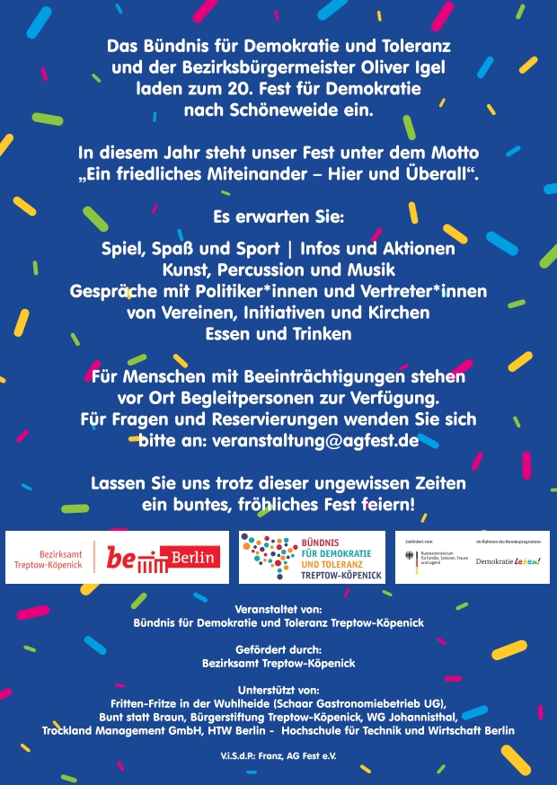 Zum 20. Mal findet am Samstag, 17.05.2025 von 13:00 bis 19:00 Uhr das „Fest für Demokratie und Toleranz“ in Berlin-Niederschöneweide am Michael-Brückner-Platz in der Spree-, Flut- sowie in der Schnellerstraße statt.