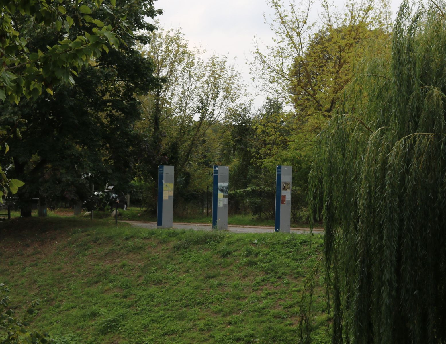 Nach 3 Kilometern sieht man auf beiden Ufern der Wuhle große blaugraue Schilder. Ich hab´ mich mal gefragt, wozu sie sind.