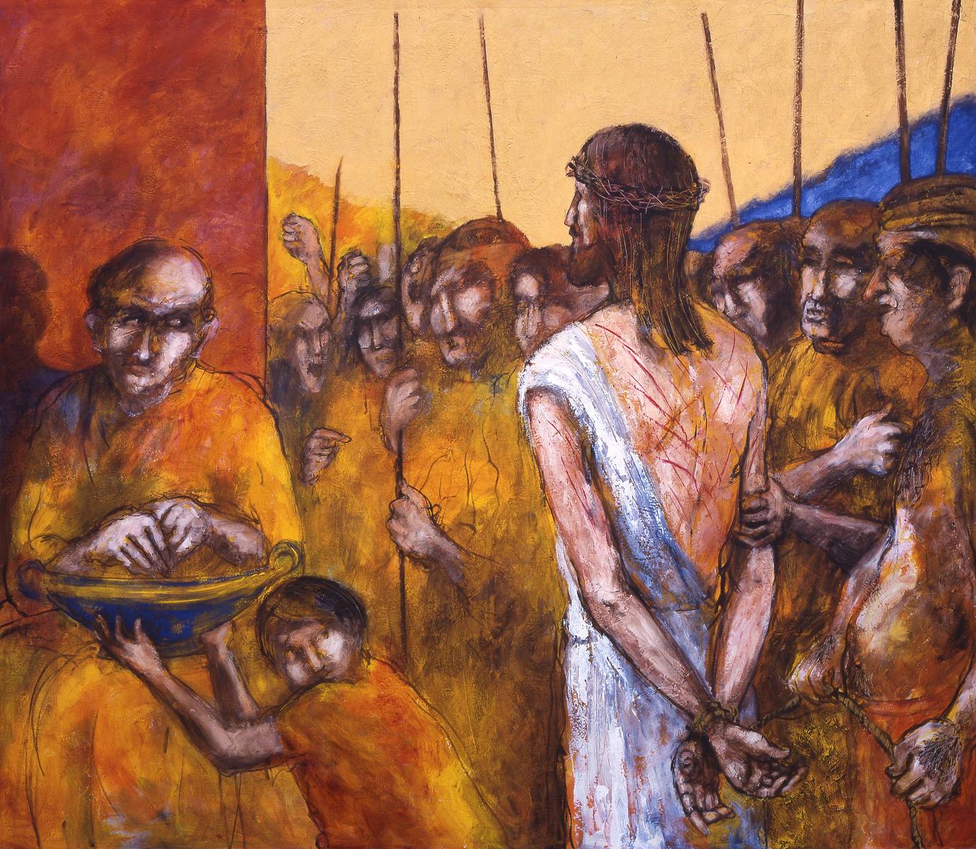 Ein Kind blickt verängstigt zum Verurteilten. Der Kontrast zum mächtigen Herrscher und zum wehr- und schutzlosen Kind könnte größer nicht sein. Das Kind hält eine Schüssel mit Wasser, in der Pilatus sein Urteil reinwaschen möchte. Die aufgebrachte Menge umzingelt den Gezeichneten.