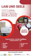 Jeden Monat unterstützt die Gemeinde St. Antonius die Ausgabestelle von LAIB und SEELE in der Hasselwerderstraße mit einer Türkollekte. Nun soll es für alle, die gerne auch haltbare Lebensmittel spenden wollen, in der Kirche St. Antonius eine dauerhafte Spendenmöglichkeit geben. Gerne dürfen Sie haltbare Lebensmittel in den dafür bereitstehenden Korb abgeben, z.B.: Nudeln Reis Kaffee… (weiterlesen) Der Beitrag wurde am 23. August 2024 geschrieben.