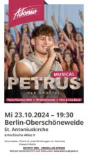 Herzlich laden wir zum Musical "Petrus - der Apostel" am Mittwoch, den 23.Oktober 2024 um 19.00 Uhr nach St. Antonius, Berlin - Oberschöneweide, Griechische Allee 9, ein. Der Eintrit frei. 70 Mitwirkende, dazu Chor und Liveband versprechen einen interessanten Abend. "Angst, Verfolgung und Gewalt sind für die Christen zur Normalität geworden, seit Jesus nicht mehr… (weiterlesen) Der Beitrag wurde am 16. Oktober 2024 geschrieben.