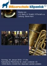 Am Sonntag, dem 28.01.2018 um 17 Uhr musiziert die Bläserschule Köpenick, die unter der pädagogischen und künstlerischen Leitung von Steve Horn steht, in St. Josef. Es werden Werke von A. Vivaldi, J.S. Bach, H. Purcell, G. Tartini, Traugott Fünfgeld und Dieter Wendel zu Gehör gebracht. Informationen zur Bläserschule Köpenick finden sich auch in diesem Artikel des… (weiterlesen) Der Beitrag wurde am 24. Januar 2018 geschrieben.