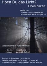 6.11.16 um 17 Uhr "Hörst du das Licht?" Chorkonzert zum Ende des Kirchenjahres Motetten von J. S. Bach, H. Schütz, A. Hammerschmidt, G. A. Homilius, A. Pärt, O. Gjelo, F. Schwemmer u.a. Vocalensemble "Fanny Hensel" Orgel: Tobias Segsa Leitung: Margarete GabrielDas Vokalensemble Fanny Hensel formierte sich im Frühjahr 2008 und bestritt ein erstes Konzert mit… (weiterlesen) Der Beitrag wurde am 29. Oktober 2016 geschrieben.