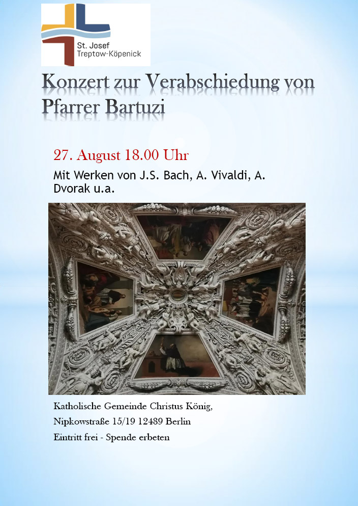 Konzert in Christus König zur Verabschiedung von Pfarrer Bartuzi – 27.8. 18 Uhr admin 18. August 2022 Christus König Adlershof / Kirchenmusik