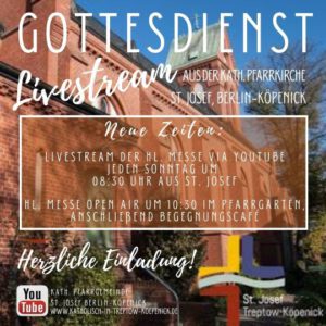 ab kommenden Sonntag, 9.8. wollen wir die Livestream-Gottesdienste um 8.30 feiern. Sie können Sie über folgenden Link https://www.katholisch-in-treptow-koepenick.de/pfarrei-st-josef-treptow-koepenick/gottesdienste-im-livestream-aus-st-josef/ live dabei sein oder die Gottesdienste auch weiterhin zu einer späteren Uhrzeit anschauen und mitfeiern.