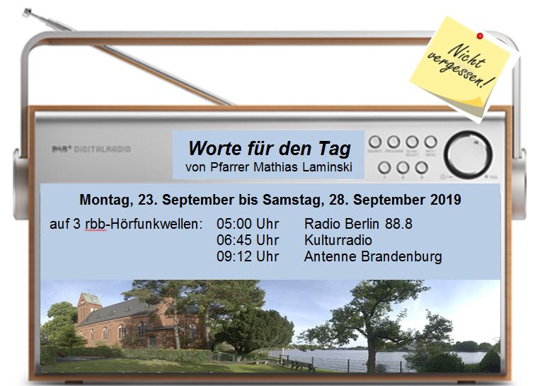 Auf den rbb-Hörfunkwellen wird Pfr.M.Laminski in der Woche vom 23. bis 28.9.2019 wieder die „Worte für den Tag“ sprechen. Und zwar um 5.50 Uhr auf „Radio Berlin 88,8“ dann auf „Kulturradio“ um 6.45 Uhr und schließlich um 9.10 Uhr auf „Antenne Brandenburg“. Hören Sie doch einfach mal rein…