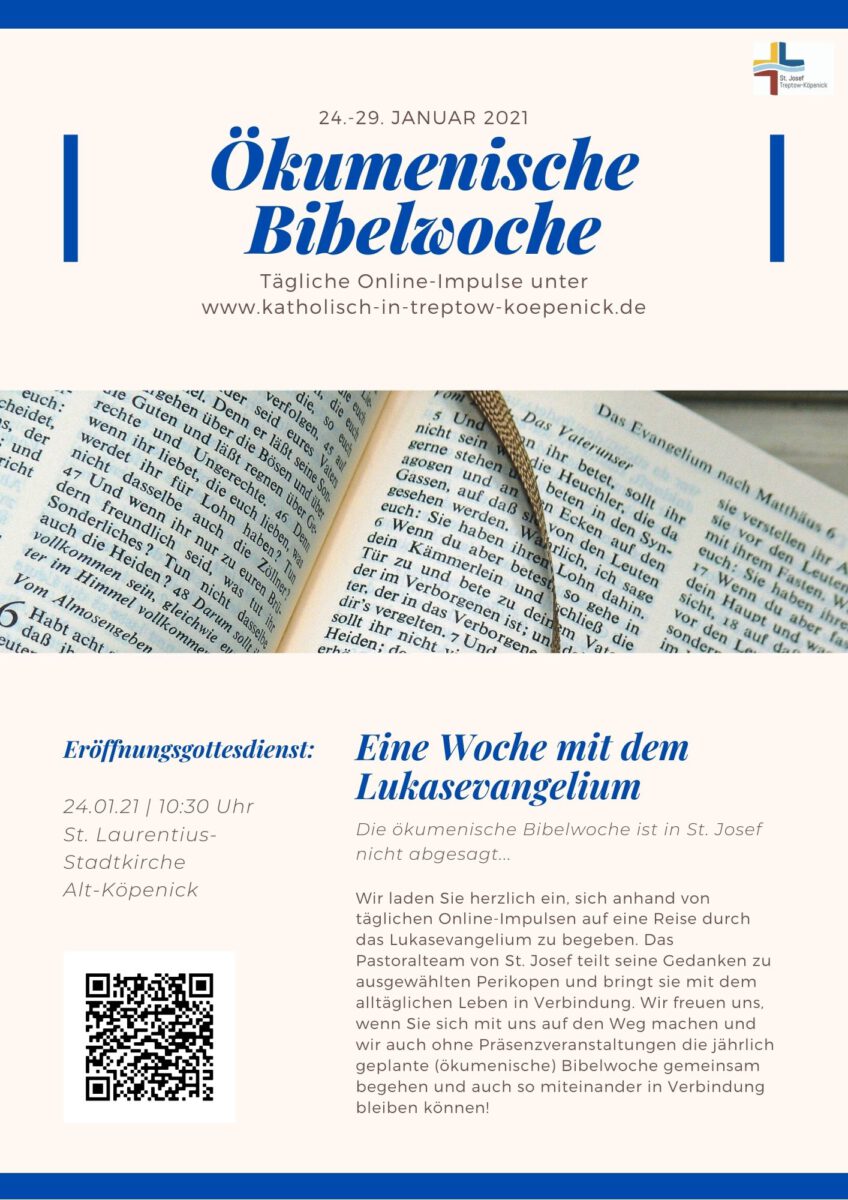 Die Beiträge finden Sie ab dem 24.01.21 täglich bei den geistlichen Impulsen. Der ökumenische Eröffungsgottesdienst findet am 24.01.21 um 10:30 in der Stadtkirche Köpenick statt.