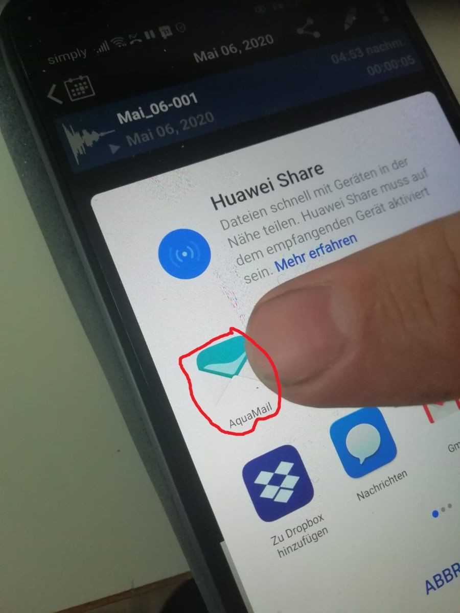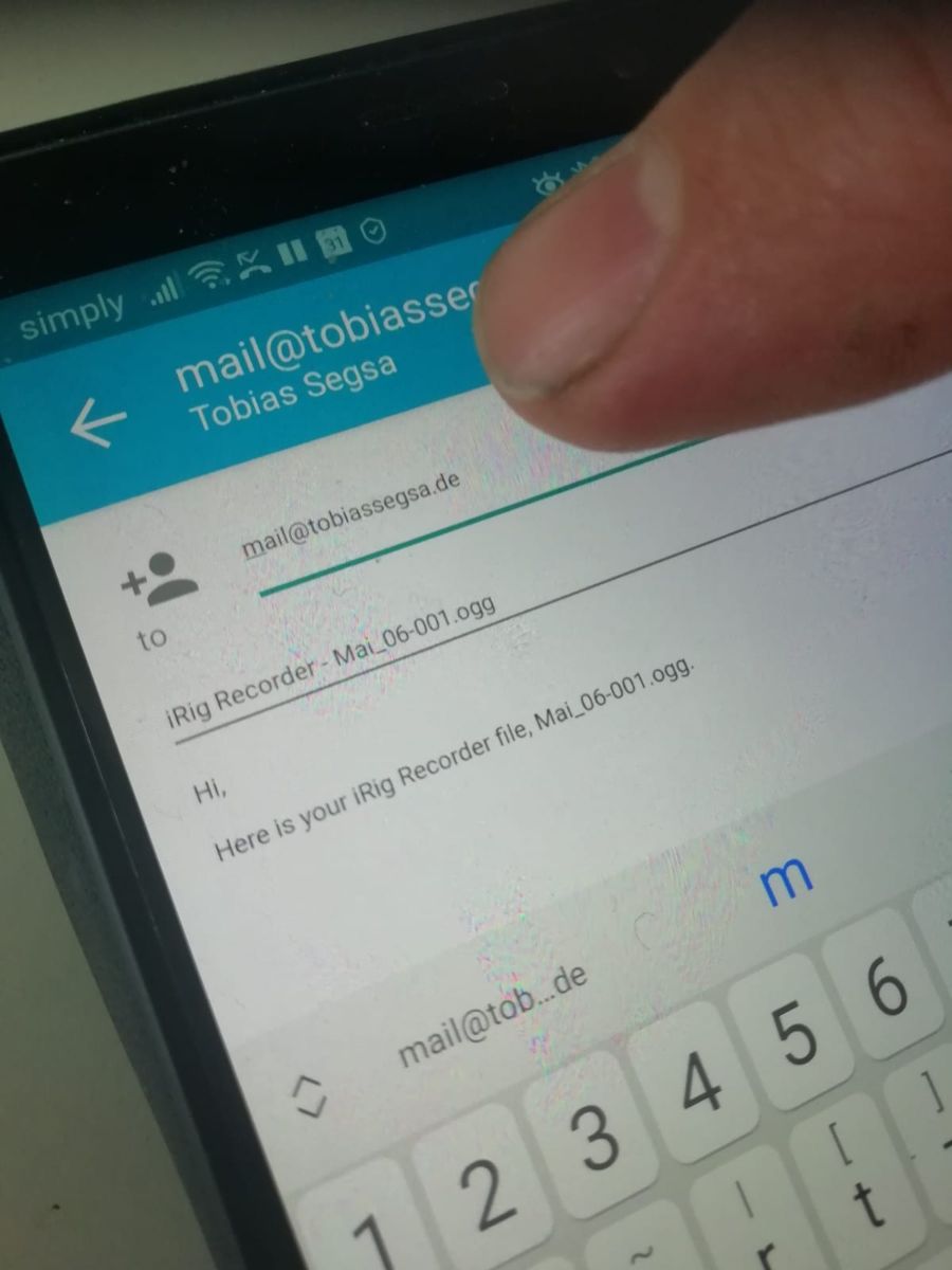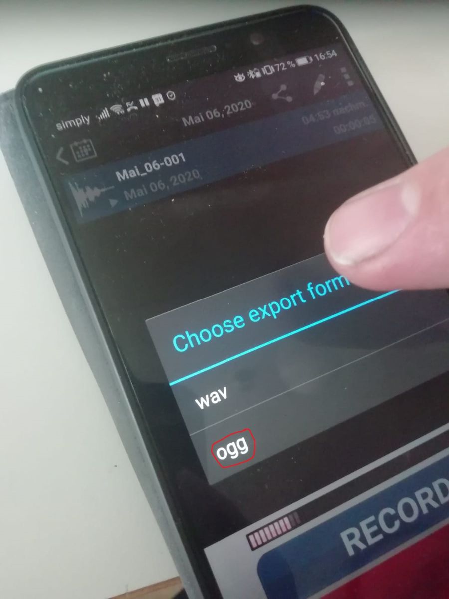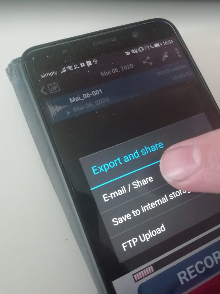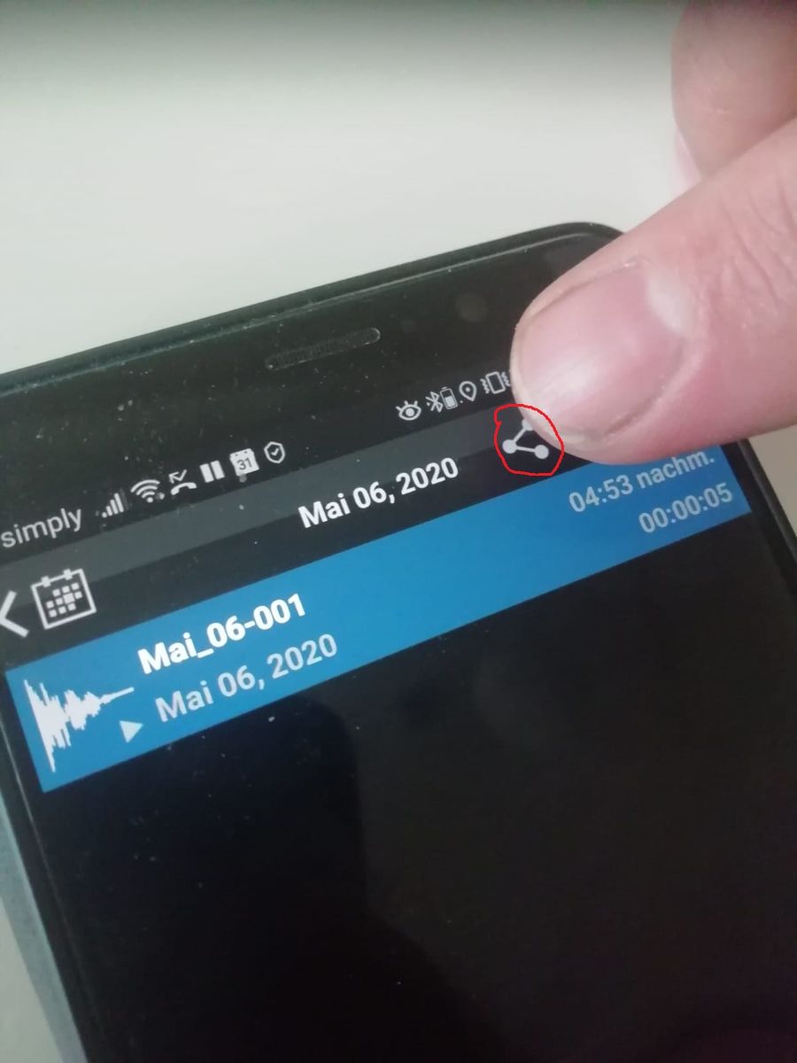 9. an mich schicken: Tippt auf das „Teilen“-Symbol und wählt E-mail / Share, danach das Format ogg