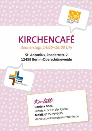 Immer donnerstags von 14:00 bis 16:00 Uhr findet unser Kirchencafé mit offener Wegweiserberatung in St. Antonius (Roedernstr. 2, 12459 Berlin-Oberschöneweide) statt. Zeitgleich ist auch die Kirche geöffnet. Eine Anmeldung ist nicht erforderlich, kommen Sie einfach vorbei!