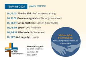 Seit einem halben Jahr sind wir nur mit dem Vorsorgeordner gemeinsam unterwegs. Viele Eindrücke und Informationen haben Sie in den letzten Monaten erhalten. Haben Sie sich schon etwas durch die Unterlagen gearbeitet? Oder vielleicht sogar bereits mit dem Ausfüllen begonnen? Heute darf ich Sie herzlich zu unserem letzten Themenabend… (weiterlesen)Friedhofsplauschen – ein regelmäßiges Kontakt- und Gesprächsangebot