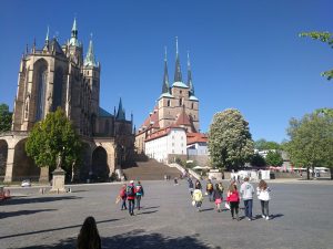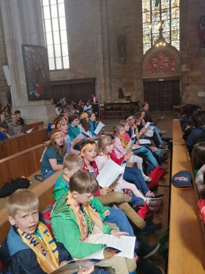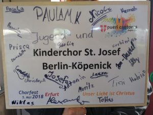 Die Chöre, die nicht heimgereist waren, waren vom beeindruckend großen Kinder- und Jugendchor am Dom mit seinen 120 Sängerinnen und Sängern und der wahnsinnig freundlichen, lebendigen und charismatischen Chorleiterin Elisabeth Lehmann-Dronke eingeladen, noch einmal in der Sonntagsmesse zu singen, diesmal also nicht aus den Bankreihen heraus sondern von den Chorpodesten aus, was uns noch einmal einen ganz anderen Eindruck bescheren sollte. Also: Aufstehen, Frühstück, Fußweg zum Bahnhof Weimar (natürlich singend), Warten auf den Zug (singend „Hosanna in der Höhe“), Zugfahrt (mit Rücksicht auf die anderen Fahrgäste nur leise summend), Fußweg zum Dom (singend, Chorfestbanner voran!), erklimmen des Domberges (singend und schnaufend gleichzeitig), kurze Probe im Dom, Sontagsmesse. Ein gemeinsames Mittagessen mit den anderen dagebliebenen Chören im Bildungshaus St. Martin auf der Rückseite des Domberges, ein erneuter Weg durch die Stadt zum Bahnhof (Sie wissen schon: immer noch singend.), die ICE-Fahrt nach Berlin (mit Ständchen für die Zugbegleiterin) und die S-Bahnfahrt nach Köpenick schlossen unsere bewegte und vor allem sehr bewegende Reise ab. Wir danken allen, die das Chorfest so großartig vorbereitet und denen, die uns begleitet und unterstützt haben und freuen uns jetzt schon auf die nächsten Chorfeste.