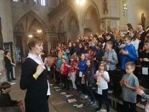 Nach frühem Aufstehen am Samstag, der Zugfahrt, einem Gang durch die Stadt, dem Erklimmen des Domberges, trafen wir um 10 Uhr im riesigen Erfurter Dom ein. Gleich die ersten Reihen vor dem Altar waren für uns reserviert, so dass wir immer hautnah dabei sein konnten. Sofort begann die Probe mit einer Bläserfanfare und ohne dass seitens der Organisatoren ein einziges Wort gesagt werden musste, setzten ca. 700 Kinder und Jugendliche singend ein: „Kommt wir ziehen hinauf zum Berg des Herrn“. Der Dom füllte sich mit überwältigendem Klang: helle Kinderstimmen, Jugendchöre in Mehrstimmigkeit, Bläser, Pauken, 2 Orgeln, aus allen Himmelsrichtungen sang und klang es.