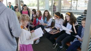 Quer durch die Stadt ging es zur Edith-Stein-Schule zum Mittagessen. Auf dem Weg konnten wir bei herrlichem Wetter das Flair der Stadt genießen und es auch beeinflussen: Euphorisiert durch die Stimmung des Chorfestes, hat der missionarische Eifer einige unserer Chorkinder gepackt. Das Chorfest-Banner ausgespannt, die Tafel „Jugend- und Kinderchor St. Josef Berlin Köpenick“ hoch erhoben, liefen sie singend durch die Menschenmassen der Innenstadt… „Hosanna in der Höhe“… „Kyrie eleison“ …. „Jesus Christ, you are my life“…“Unser Licht ist Christus“, das Chorheft wurde rauf und runter gesungen.