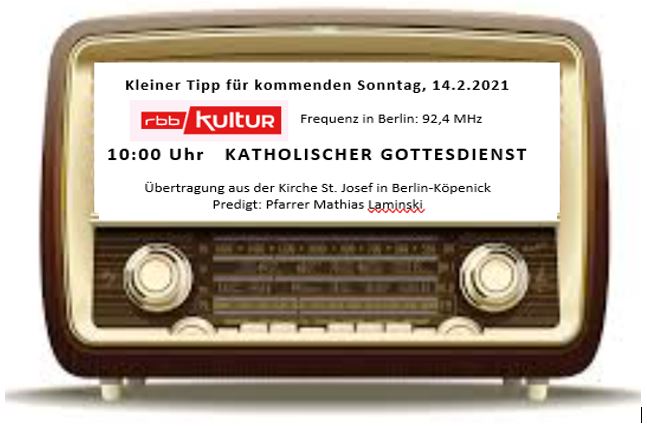 Am kommenden Sonntag, dem 14.Februar um 10.00 überträgt der rbb auf „rbbKultur“ (Berlin Frequenz 92,4) die Hl.Messe aus der Pfarrkirche St.Josef. Musikalisch hat sich unser Kirchenmusiker T.Segsa wieder etwas Schönes einfallen lassen. Den Gottesdienst und die Predigt hält Pfr. M.Laminski zum Valentinstag. Natürlich kann man auf rbbKultur hörend mitfeiern oder aber via Livestream über unsere Website hören und natürlich darüber auch sehen.