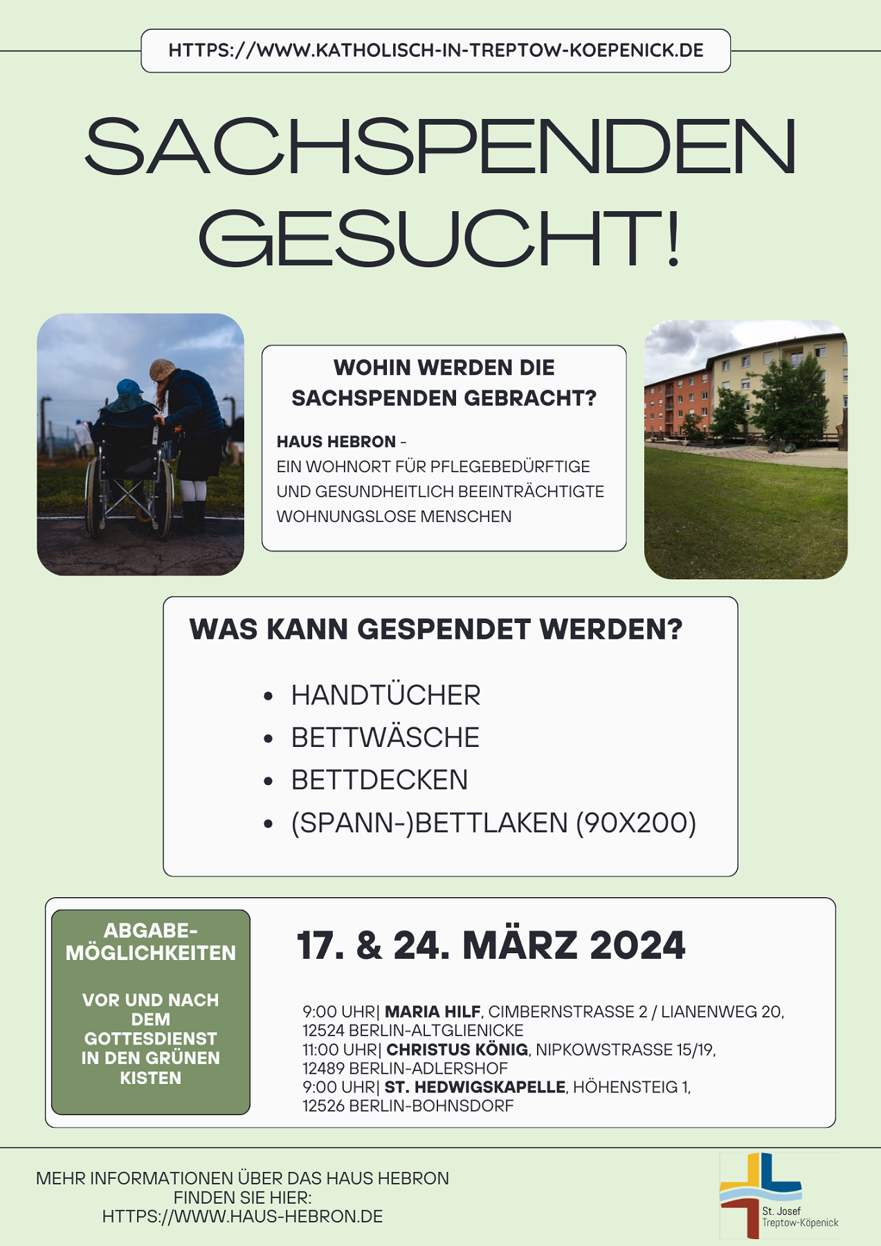 Die Temperaturen werden frühlinghaft und so manch einer ist vielleicht dabei den „Frühjahrsputz“ zu machen. Wenn Sie dabei auf sehr gut erhalten Handtücher, Bettwäsche und Bettdecken stoßen, die Sie selbst nicht mehr benötigen, dann freut sich das Haus Hebron über die Sachspenden!