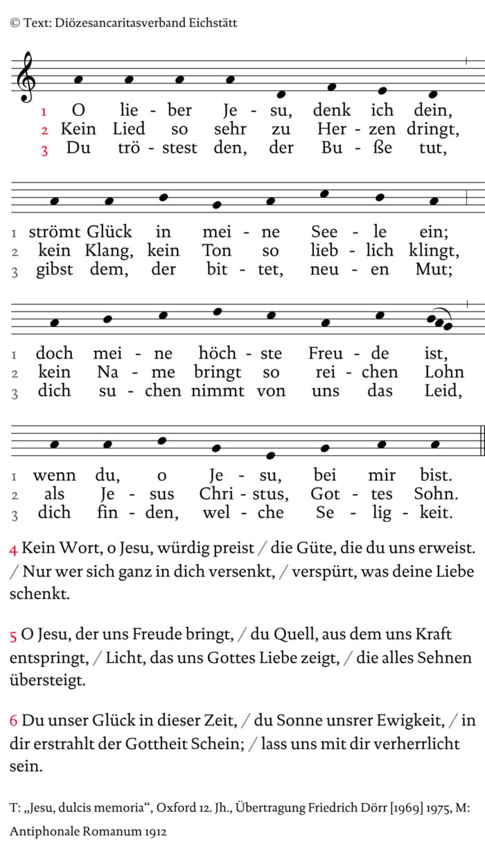 Der gregorianische Hymnus Jesu dulcis memoria ist uns als O lieber Jesu, denk ich dein bekannt und ist unter der Nummer 368 zu finden.